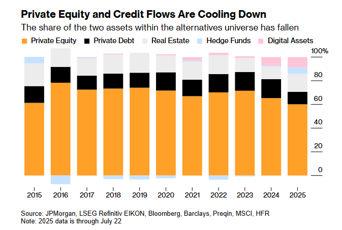 “Within alternative asset classes, digital assets and hedge funds have been seeing an acceleration of inflows this year, in sharp contrast to the weak fundraising seen in private equity and private credit,” JPMorgan’s flows guru Nikolaos Panigirtzoglou told Bloomberg.