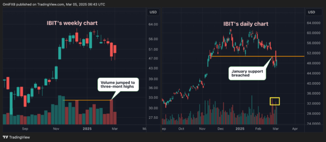 Trading volume picked up last Tuesday as IBIT broke below the horizontal support at $50.69 to signal more losses ahead.