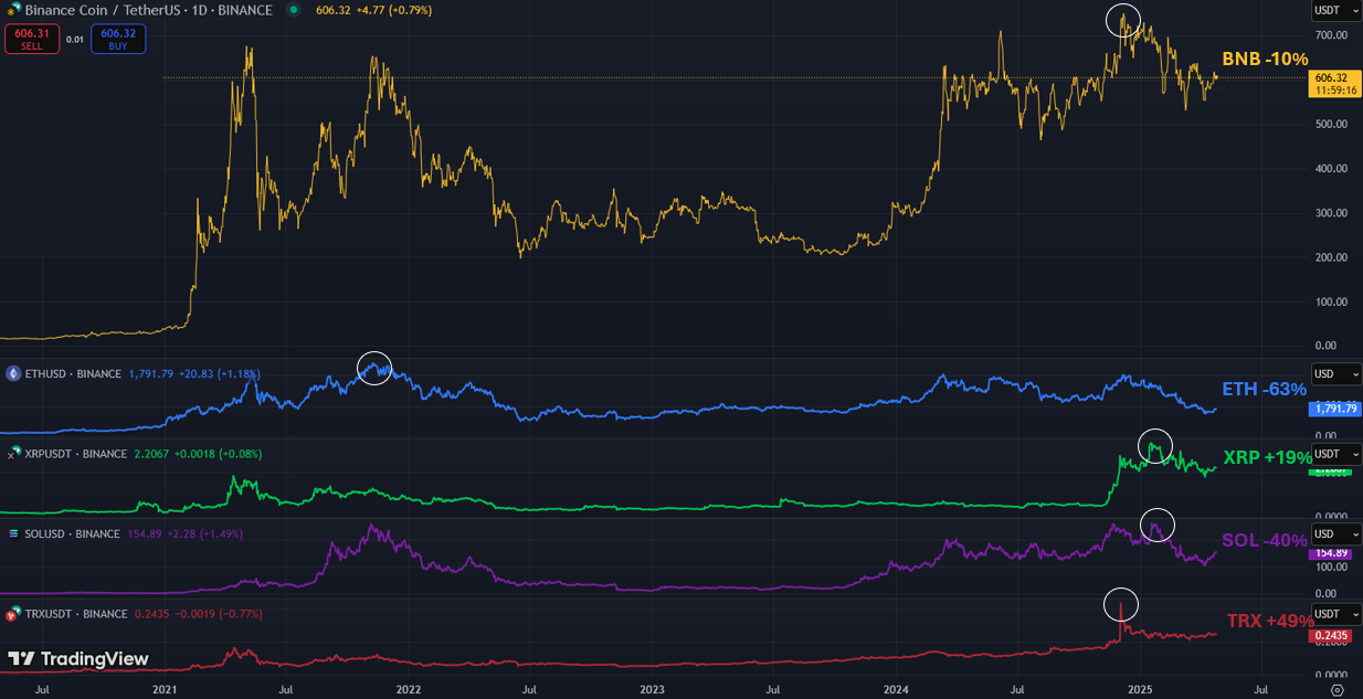 When comparing current prices to their previous cycle highs (mostly from May or November 2021), BNB is now down only about 10%. That’s significantly better than ETH (ETH), which is down 63%, and Solana, down 40%. However, XRP (+19%) and TRX (+49%) have performed even better.