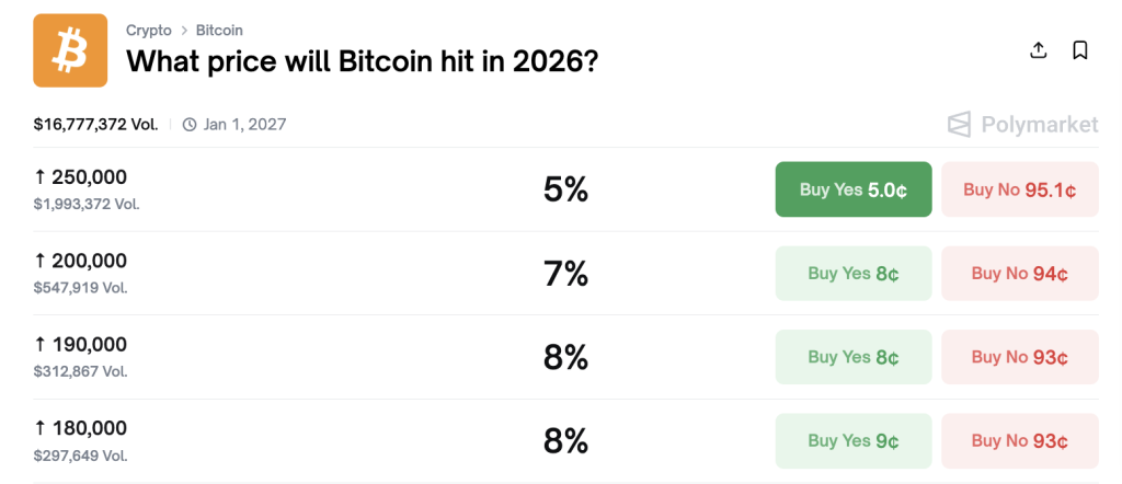 Longer term, Bitcoin has a 23% chance of reclaiming the $120,000 level in 2026, with just a 10% chance of the asset reaching above $150,000.