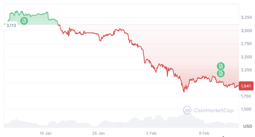 Ether is trading at $1,941 as of publication, down 41.65% over the past 30 days, according to CoinMarketCap.