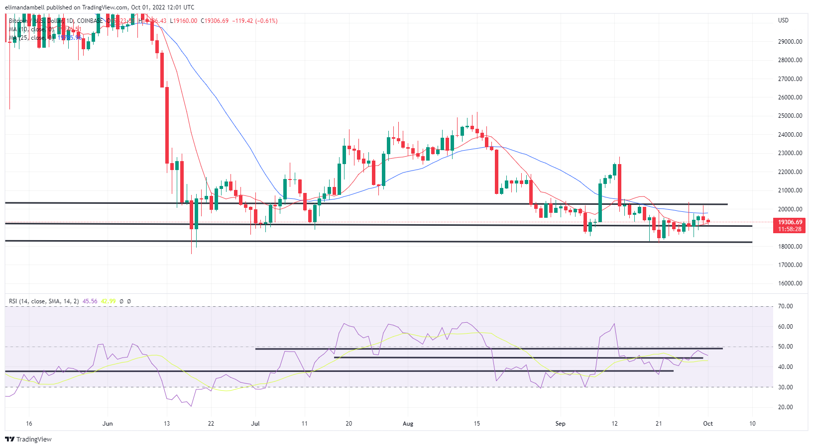After a move above $20,000 on Friday, bitcoin was back in the red on Saturday, as prices fell close to a key support point. As a result of this move the token has been largely unchanged in the last week, with price up 0.87% in the last seven days. Ethereum was also lower to start the weekend.