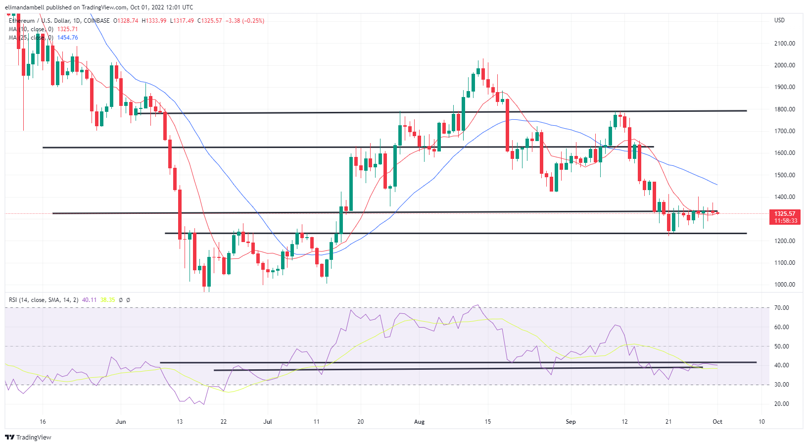 Like with bitcoin, ethereum’s 14-day RSI is also consolidating, and is hovering below a ceiling of 41.00 as of writing.
