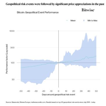 Head of research at Bitwise Europe, André Dragosch, highlighted this potential in an X post, citing data from across the top 20 geopolitical risk events since 2010. The analyst said that Bitcoin has averaged a 64.6% price increase within 50 days, with a median gain of 17.3%.