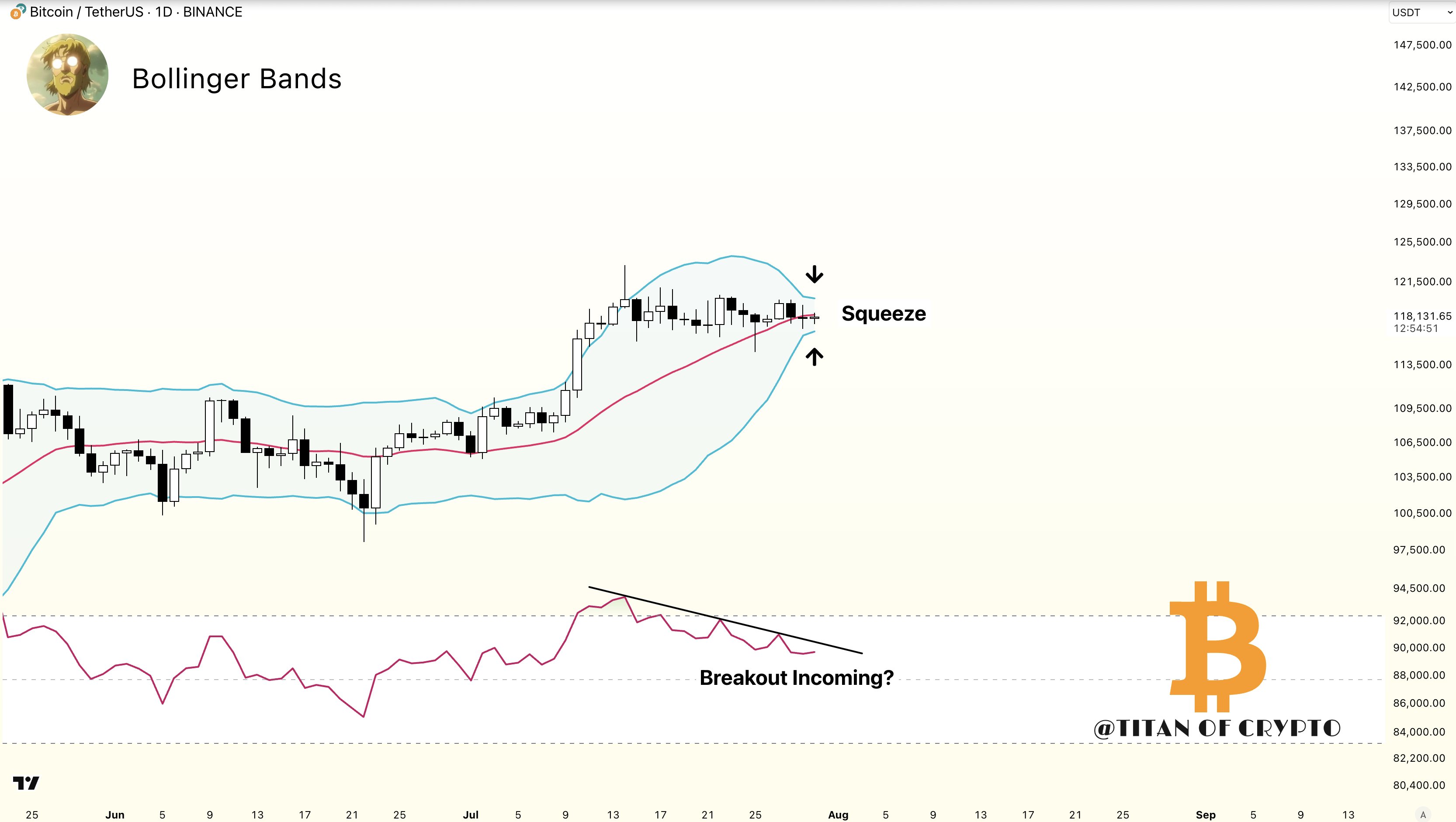 “Bitcoin in a pressure cooker. Bollinger Bands are squeezing = volatility is drying up. RSI is compressing too. A big move is brewing.”