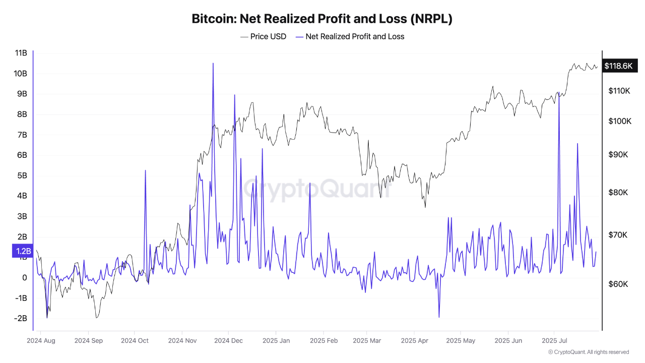 While fresh spot demand appears to be cooling, there are signs that profit-taking is also tapering off. The Net Realized Profit/Loss (NRPL) metric shows no evidence of large-scale exits, and the Adjusted SOPR remains well below the 1.10 threshold typically associated with market tops. These indicators suggest that investors remain confident in the current market structure and are not rushing to secure profits.