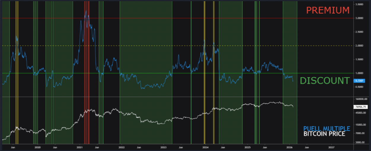 Bitcoin appears to be in “accumulation” territory, according to the Puell Multiple, which tracks miners’ daily revenue against the annual average. It has extended its decline into the discount zone, following Bitcoin’s latest drop to 15-month lows below $73,000.