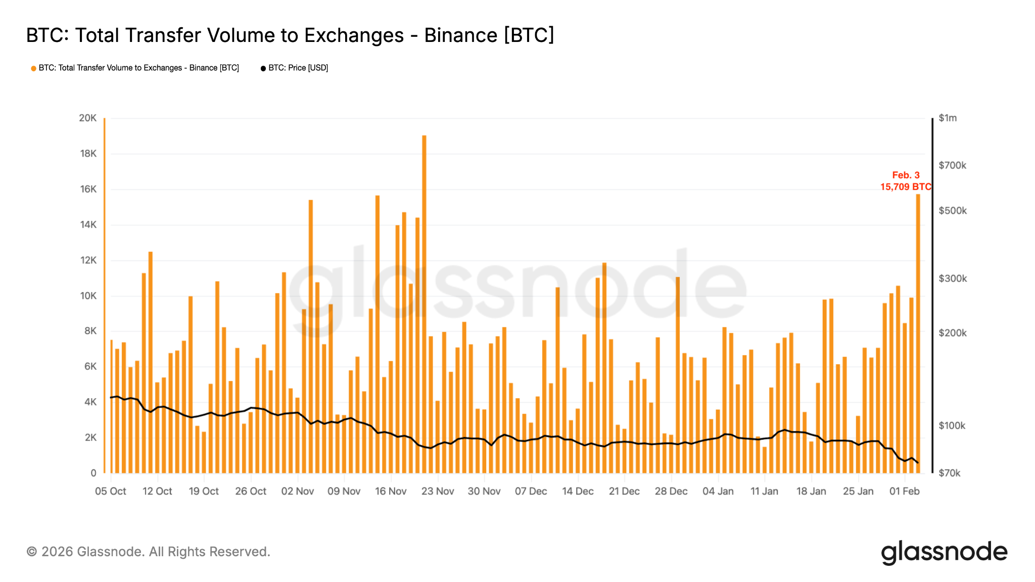 Daily BTC inflows to Binance reached 15,709 on Tuesday, the highest reading since Nov. 21, 2025, based on onchain data. Historically, similar inflow peaks, such as the one recorded in November, have been followed by sharp downward moves in price.