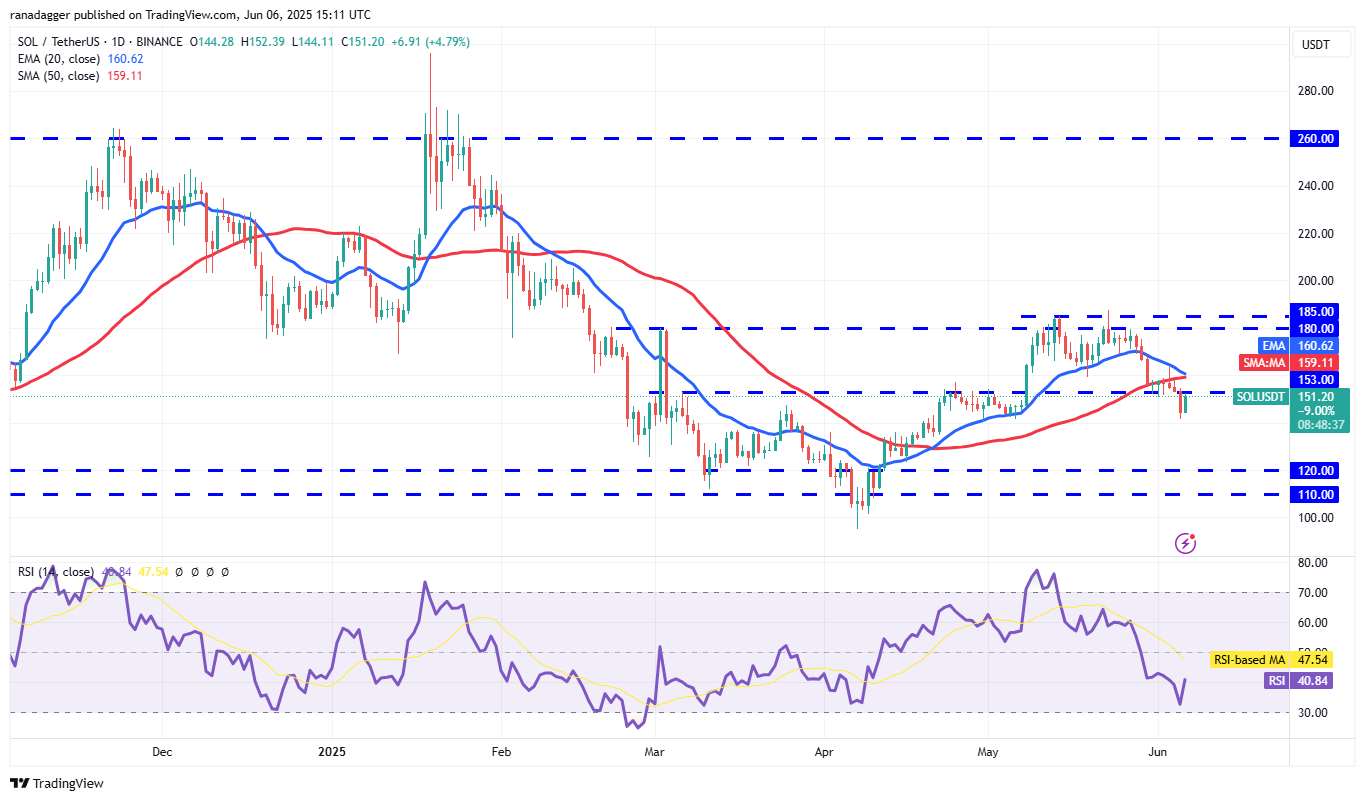 Solanaโs (SOL) failure to rise above the 20-day EMA ($160) on June 3 attracted sellers, pulling the price below the $153 support on June 5.