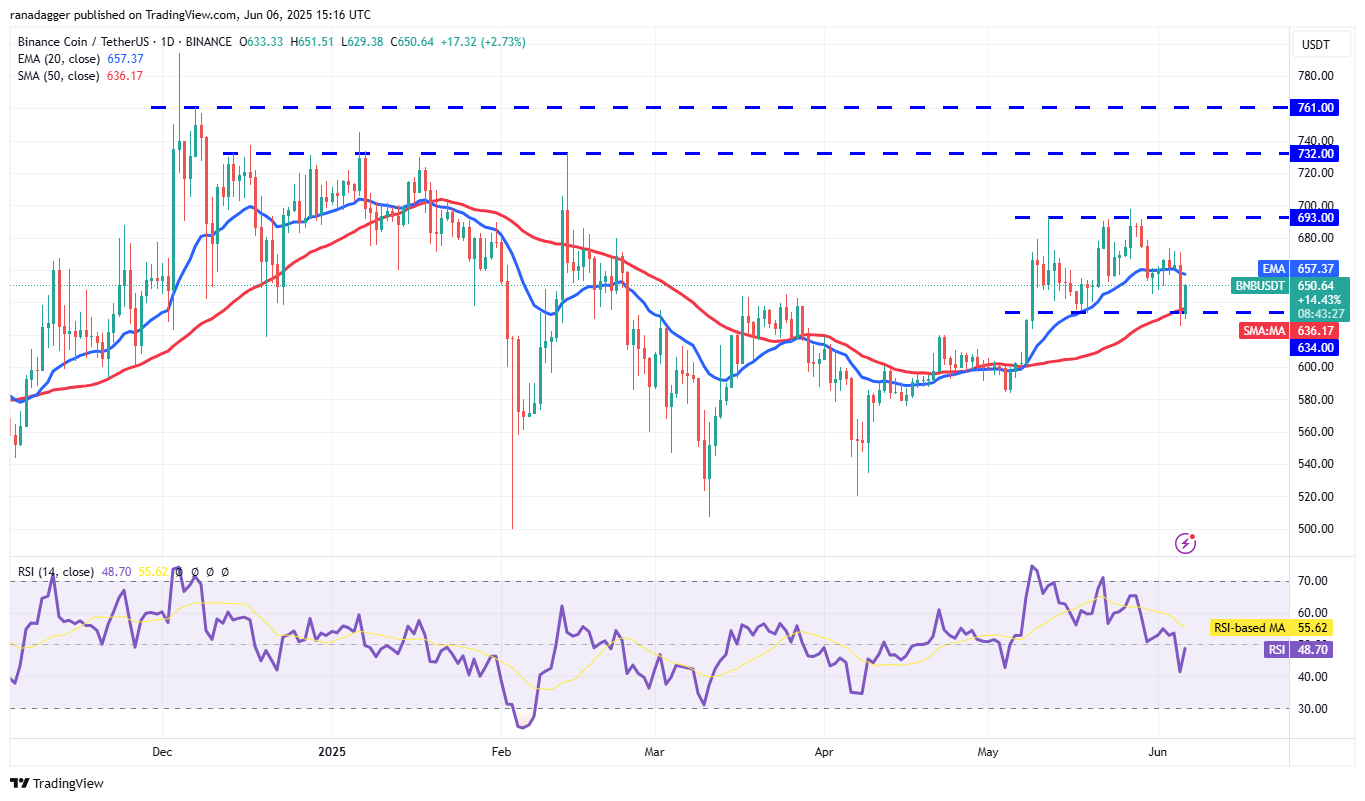 BNB (BNB) dropped below the 20-day EMA ($657) on June 5 and headed to the 50-day SMA ($636).