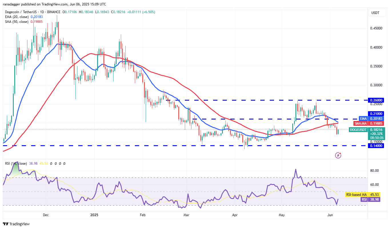 Buyers are trying to defend the $140 support, but the relief rally is likely to face stiff resistance at the 20-day EMA. If the price turns down sharply from the 20-day EMA, the likelihood of a break below $140 increases. The SOL/USDT pair could then drop to $120. Buyers are expected to fiercely defend the $120 to $110 support zone.
