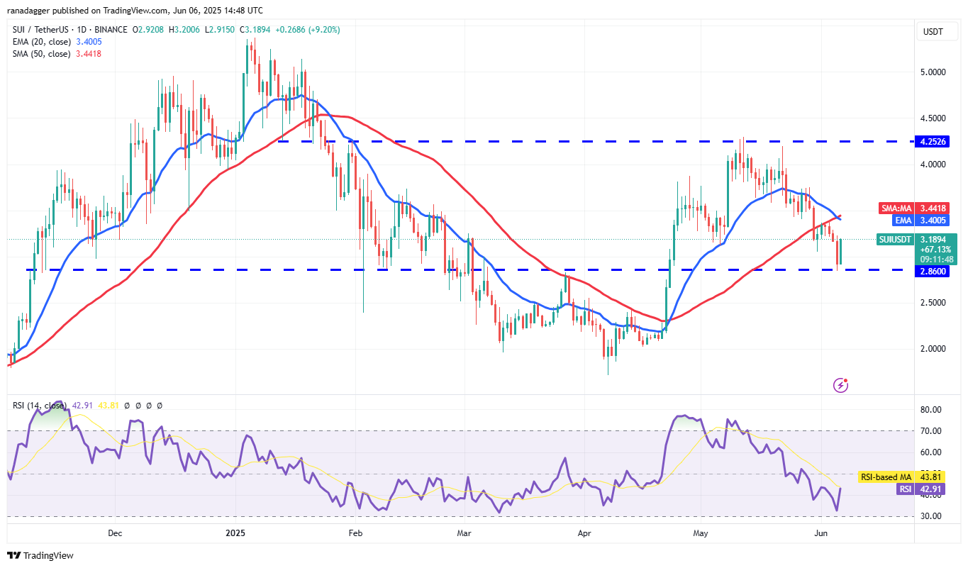 Sui (SUI) was rejected from the 50-day SMA ($3.44) on June 3 and reached the $2.86 support on June 5.