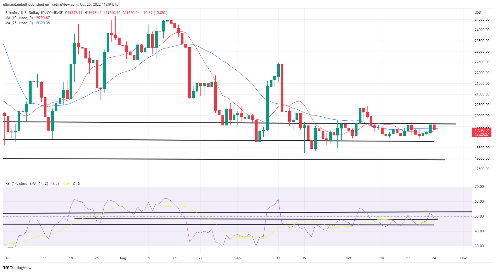 BTC/USD slipped to an intraday low of $19,206.32 earlier in today’s session, moving away from Monday’s peak of $19,698.