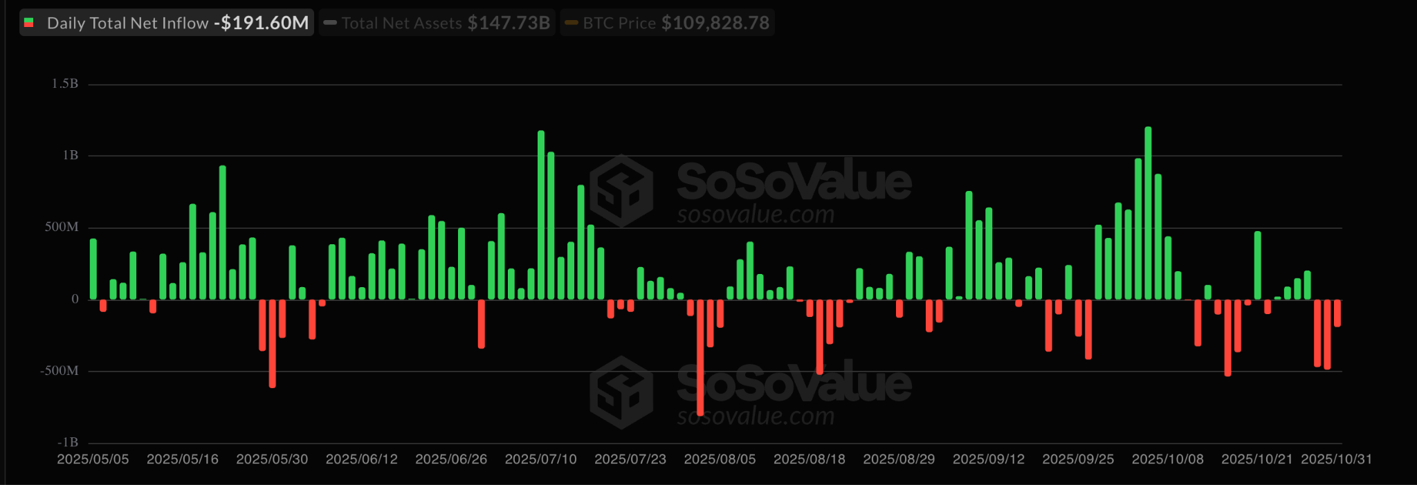 On Oct. 31, spot Bitcoin ETFs saw a total daily net outflow of $191 million, with none of the twelve ETFs recording inflows.