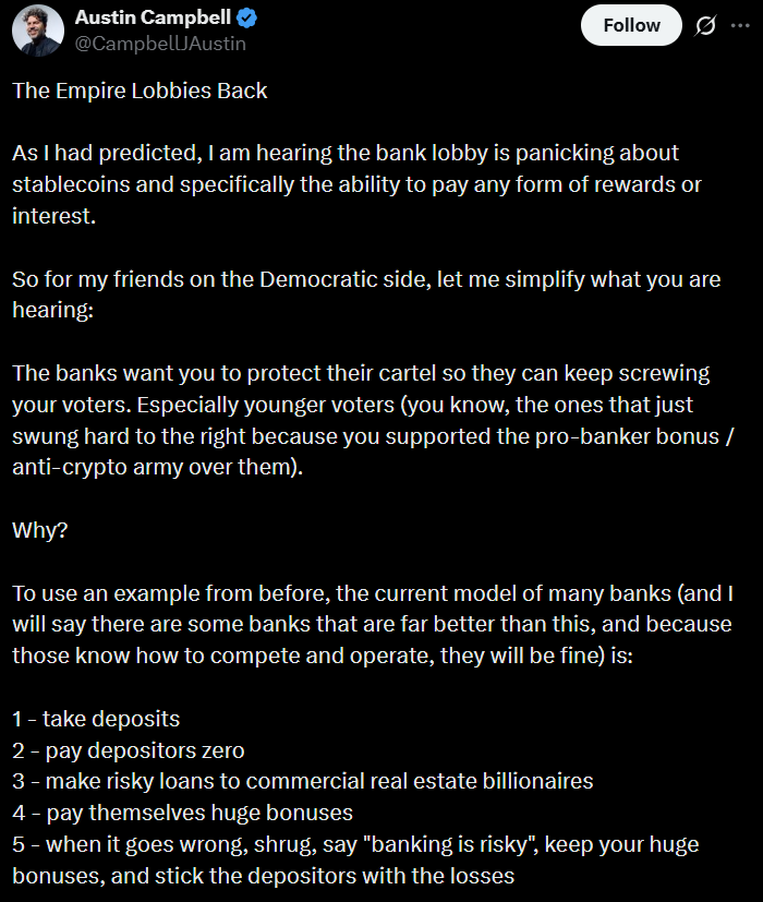 Publicly, the groups claim their concern is that stablecoins could undermine the banking system. However, critics say the more pressing fear may be that stablecoins will erode their business model — especially given banks’ long history of offering minimal returns to depositors.