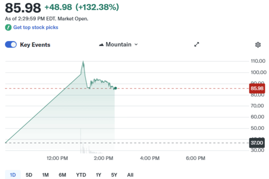 The stock, trading under the ticker symbol BLSH, soared to an intraday high of $118.00, marking a 218% gain from its IPO price, on trading volume of roughly 38 million shares, according to Yahoo Finance data.