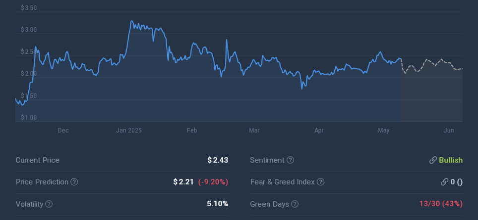 Technical indicators point to a possible drop to around $2.21 by June 22, 2025, which would be a -9.20% change from now. The current sentiment gauge reads Bullish, but the Fear & Greed Index sits at 0.
