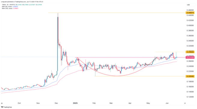 The daily chart shows that TRX has been in a gradual uptrend in recent months, rising from a February low of $0.20 to $0.2743 today.