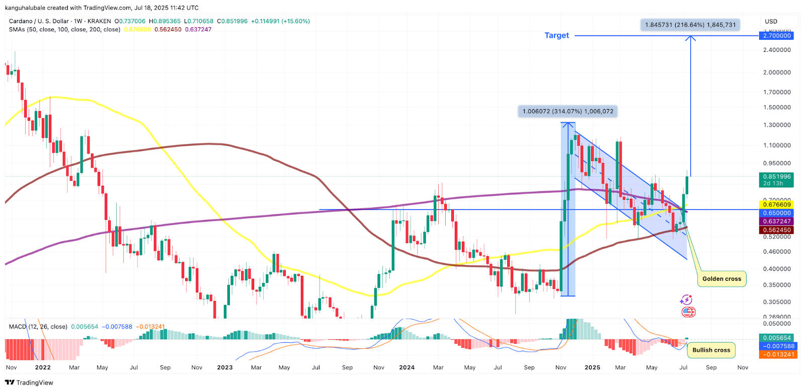 • Multiple bullish chart signals suggest ADA price can climb over 200% toward $3.