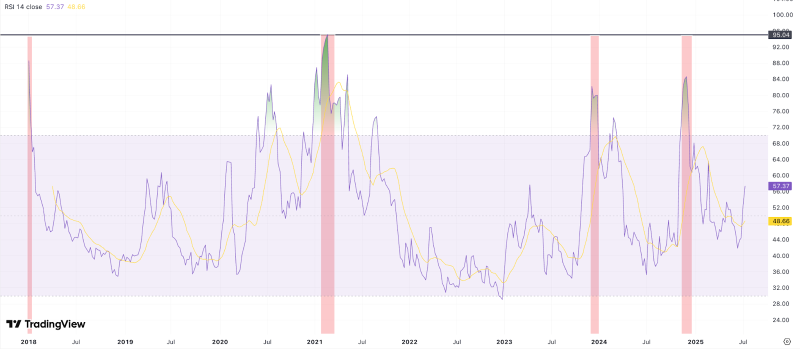 The weekly relative strength index (RSI), meanwhile, shows that XRP has more room to run before reaching overheated levels, such as in the 2018, 2021, and December 2024 cycle tops.