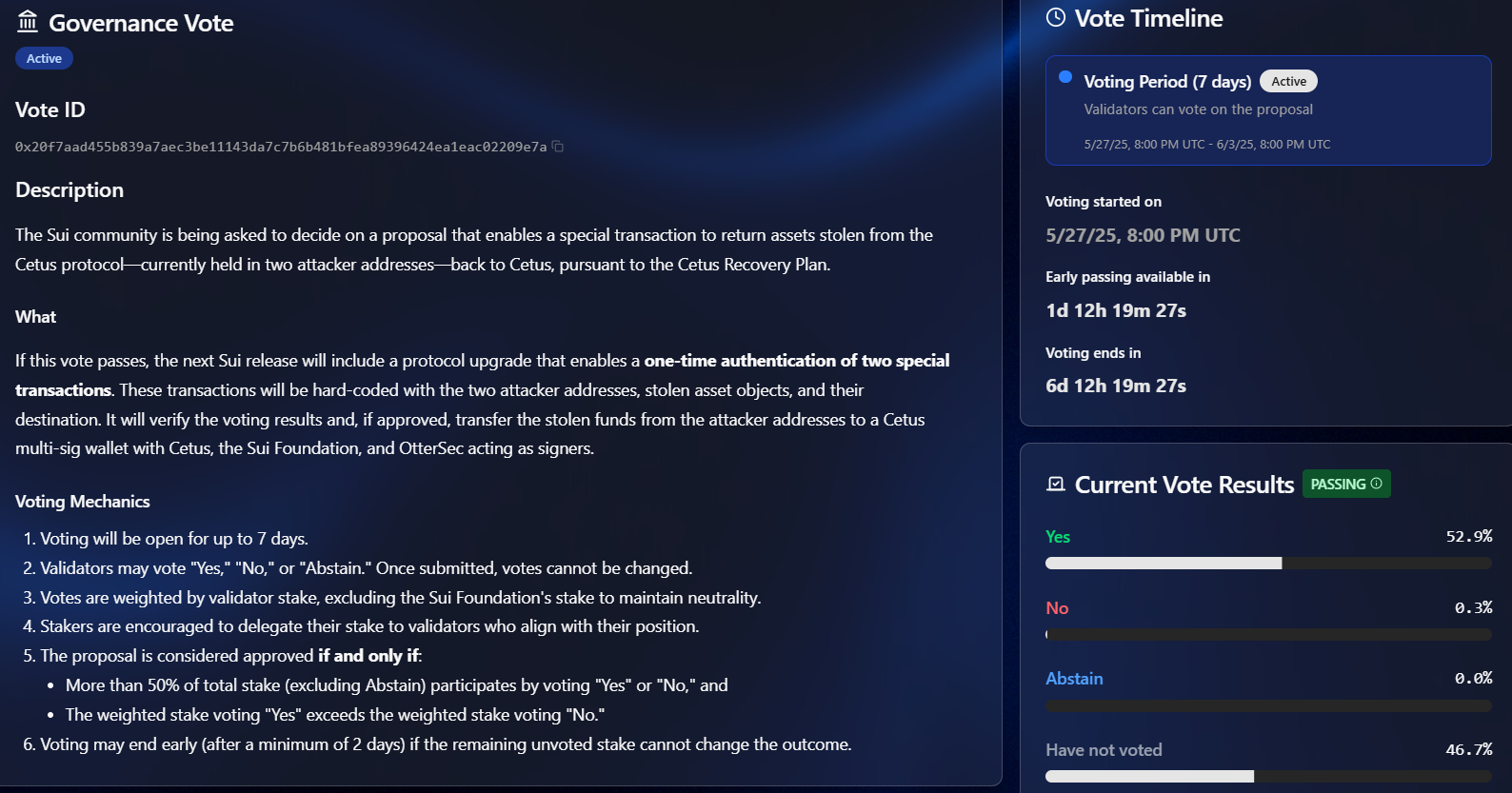 Sui-based decentralized exchange Cetus may be one step closer to recovering funds lost in a recent exploit, pending the outcome of a community governance vote scheduled to end June 3.