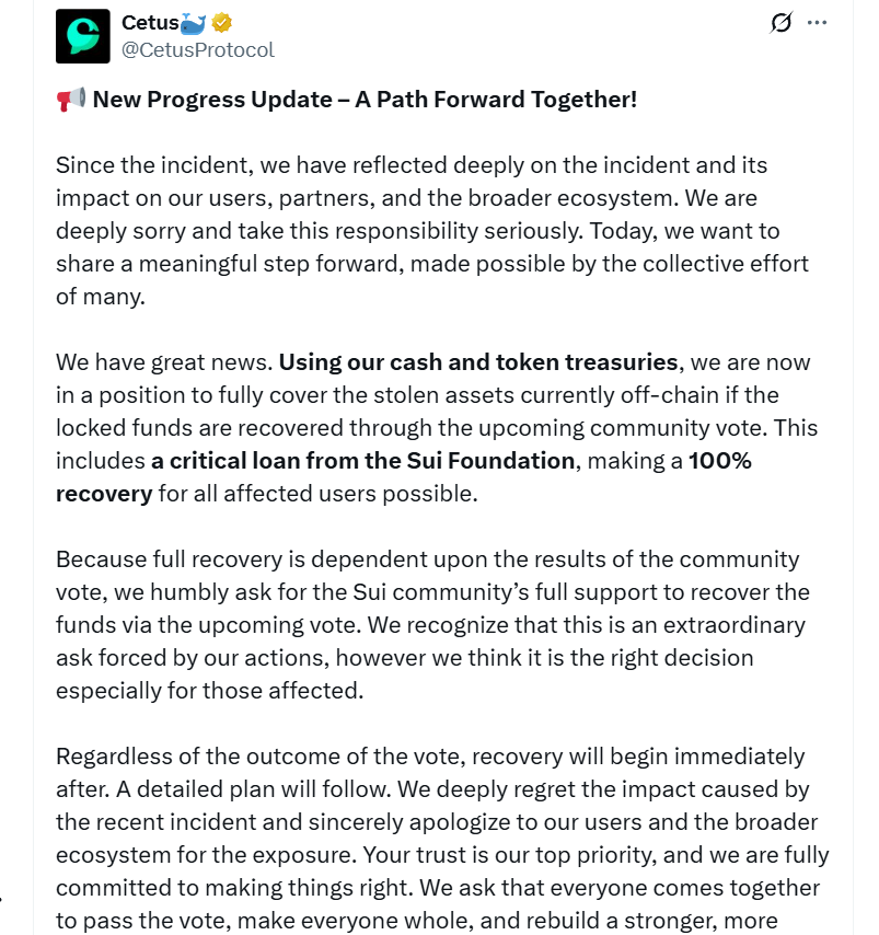 “This includes a critical loan from the Sui Foundation, making a 100% recovery for all affected users possible,” Cetus said in a May 27 X post.