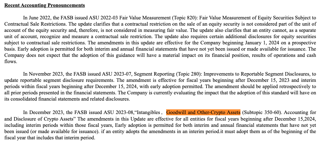 โIn December 2023, the FASB issued ASU 2023-08, โIntangibles, Goodwill and Other-Crypto Assets (Subtopic 350-60). Accounting for and Disclosure of Crypto Assets,โ the filing notes, adding that firms are allowed to start using the new rules early if their financial reports havenโt been published yet.