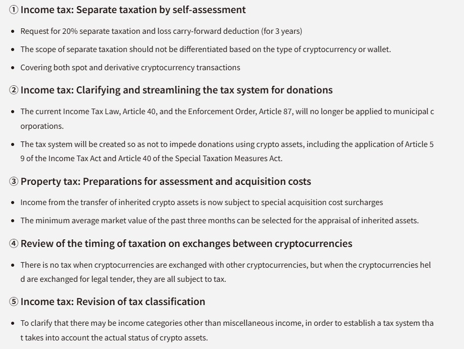 The Japan Virtual Currency Exchange Association and the Japan Cryptocurrency Business Association jointly called for a 20% separate self-assessment tax on crypto income, along with loss carry-forwards for three years and consistent tax rules across different types of crypto assets and wallets.