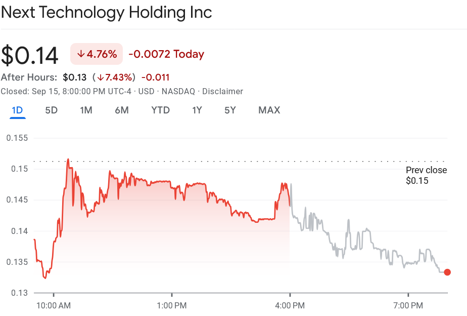 Next Technology (NXTT) shares fell 4.76% to $0.14 on the Nasdaq on Monday and another 7.43% in after-hours when the news was announced, Google Finance data shows.