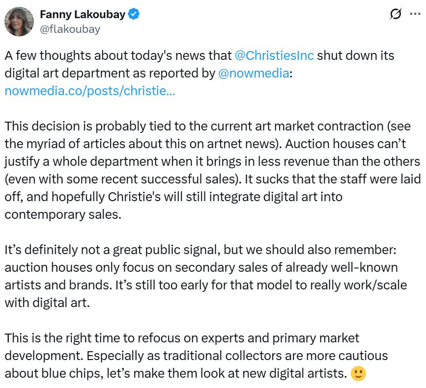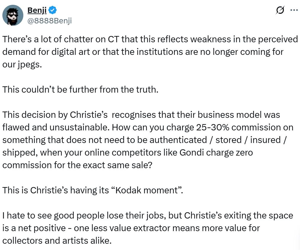 “I hate to see good people lose their jobs, but Christie’s exiting the space is a net positive— one less value extractor means more value for collectors and artists alike.”