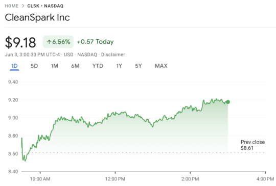 On June 3, the day the company announced its May operational performance, CleanSpark’s shares were up 6.5% intraday.