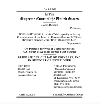 In an April 30 filing in the Supreme Court of the United States (SCOTUS), lawyers for Coinbase argued that a First Circuit Court of Appeals decision set a “dangerous precedent” for crypto users, potentially allowing the government to “trace users’ every crypto transaction in the past and monitor every crypto transaction in the future.” The appeal to the Supreme Court stemmed from petitioner James Harper, a Coinbase user, who took legal action against the IRS after the crypto exchange was forced to turn over transaction data to the government using a sweeping “John Doe” summons in 2017.