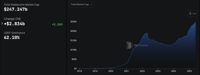 Stablecoins are seeing increased adoption. According to DefiLlama data, the market capitalization of stablecoins reached $247 billion on May 28, a steep rise from $161 billion a year before. Over the past 12 months, the market cap has jumped 54%.