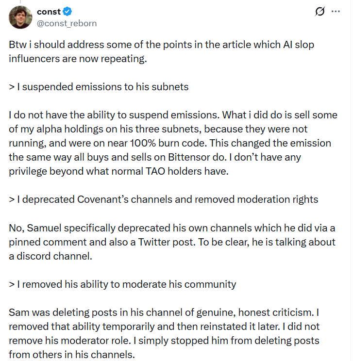 Steeves also denied stripping Covenant AI of its moderation rights, saying he only temporarily removed the team’s ability to delete posts before restoring it. He added that large token sales would have been visible onchain.