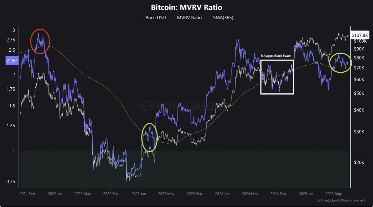 “Historically, as long as MVRV stays above its SMA365, the uptrend tends to continue,” explained CryptoQuant analyst Burakkesmeci in a QuickTake analysis, adding: