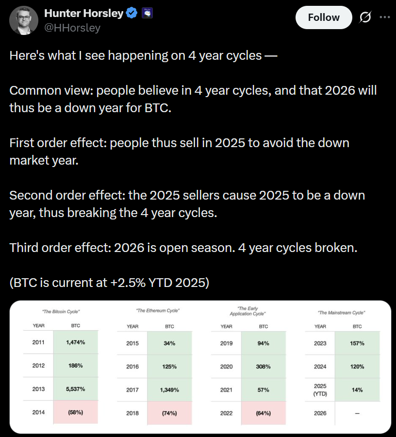 Meanwhile, participants continue to debate Bitcoin’s trajectory relative to its four-year cycle, with some saying the rally didn’t end at its October peak of $126,000.