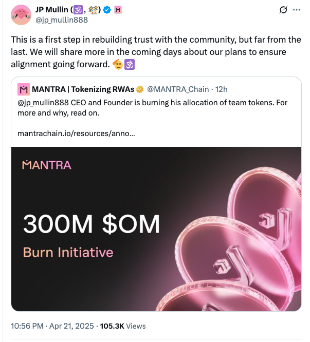 Mantra says CEO has begun the process of burning his 150 million OM tokens