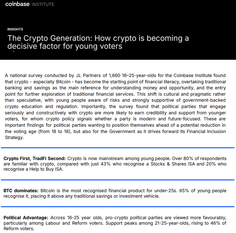 Nearly half of young people said they would trust a political party more if it showed an understanding of crypto and blockchain technology, while 26% said they were more likely to support one that backed pro-innovation crypto policy. More under-25s now recognize Bitcoin than any ISA, savings bond or other legacy savings product, with 65% awareness making BTC the most recognized financial product among this group.