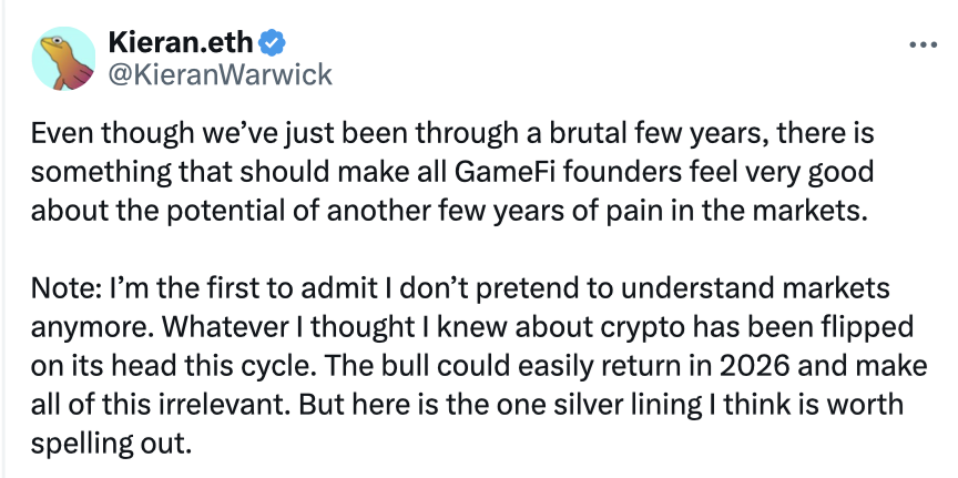 However, Warwick warned that this principle does not apply to onchain games that rely on crypto-market liquidity to function, such as play-to-earn and risk-to-earn models.