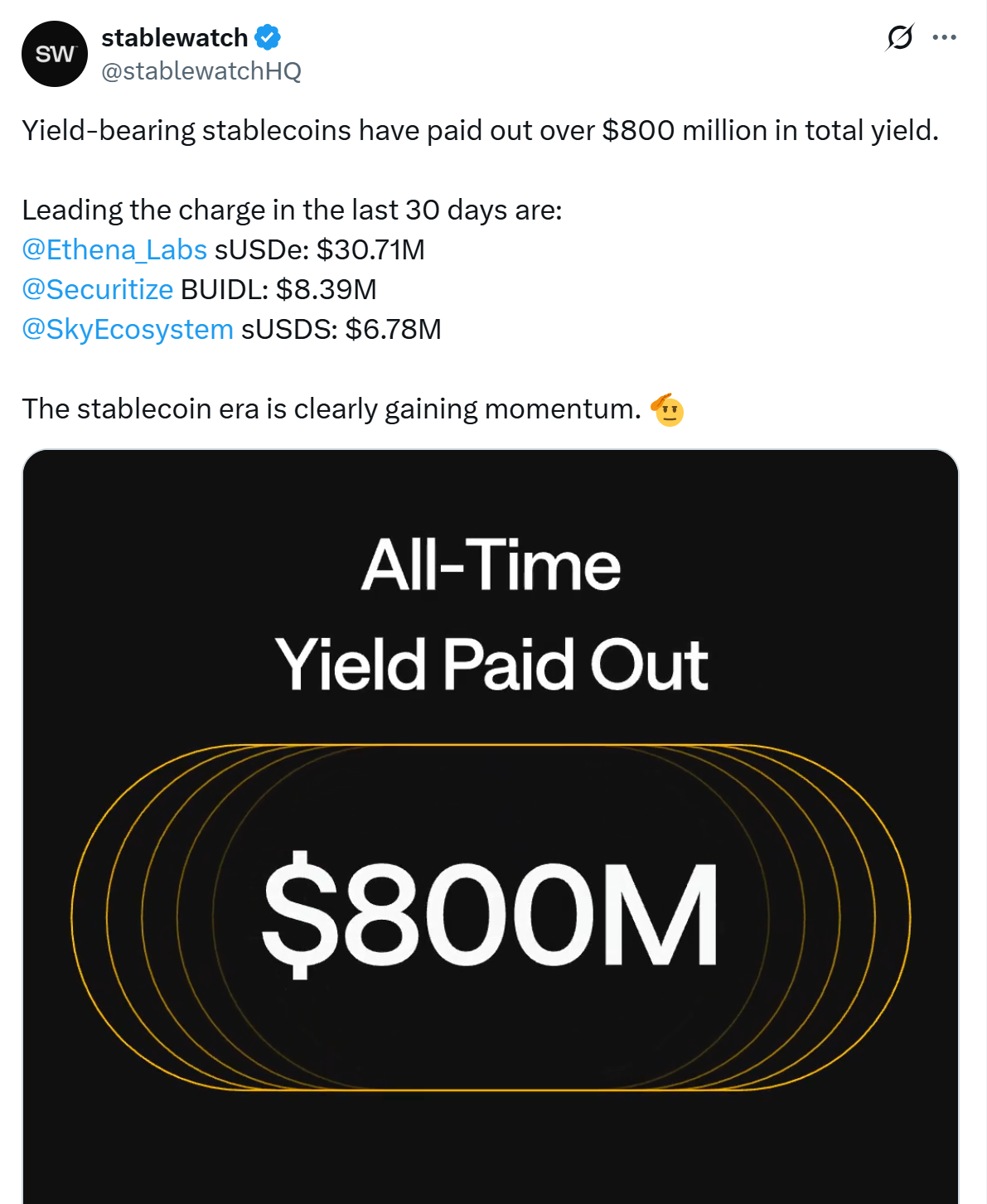 Yield-bearing stablecoins have distributed over $800 million in total returns to holders so far, according to a recent post by StableWatch. Over the past 30 days, Ethena Staked USDe (sUSDe) led payouts with $30.71 million, followed by Securitizeโs BUIDL at $8.39 million and Sky Ecosystemโsย staked USDe (sUSDe) with $6.78 million.