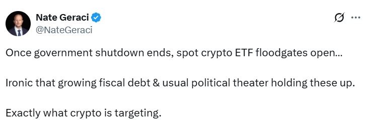 ETF analyst and NovaDius Wealth Management president Nate Geraci predicted in an X post on Monday that โOnce government shutdown ends, spot crypto ETF floodgates open,โ with mass approvals expected.