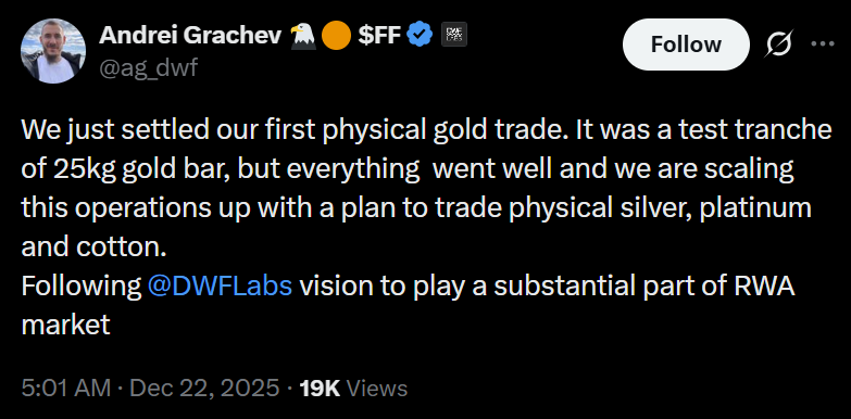 DWF Labs has expanded beyond digital assets into physical commodities, completing the settlement of a 25-kilogram gold transaction in a move that underscores a broader push toward diversification within the crypto sector.