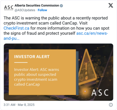 The Alberta Securities Commission said in a March 7 alert that a “crypto investment scam called CanCap” faked an endorsement from then-Prime Minister Justin Trudeau through a fake news article from Canada’s national public broadcaster, the CBC.
