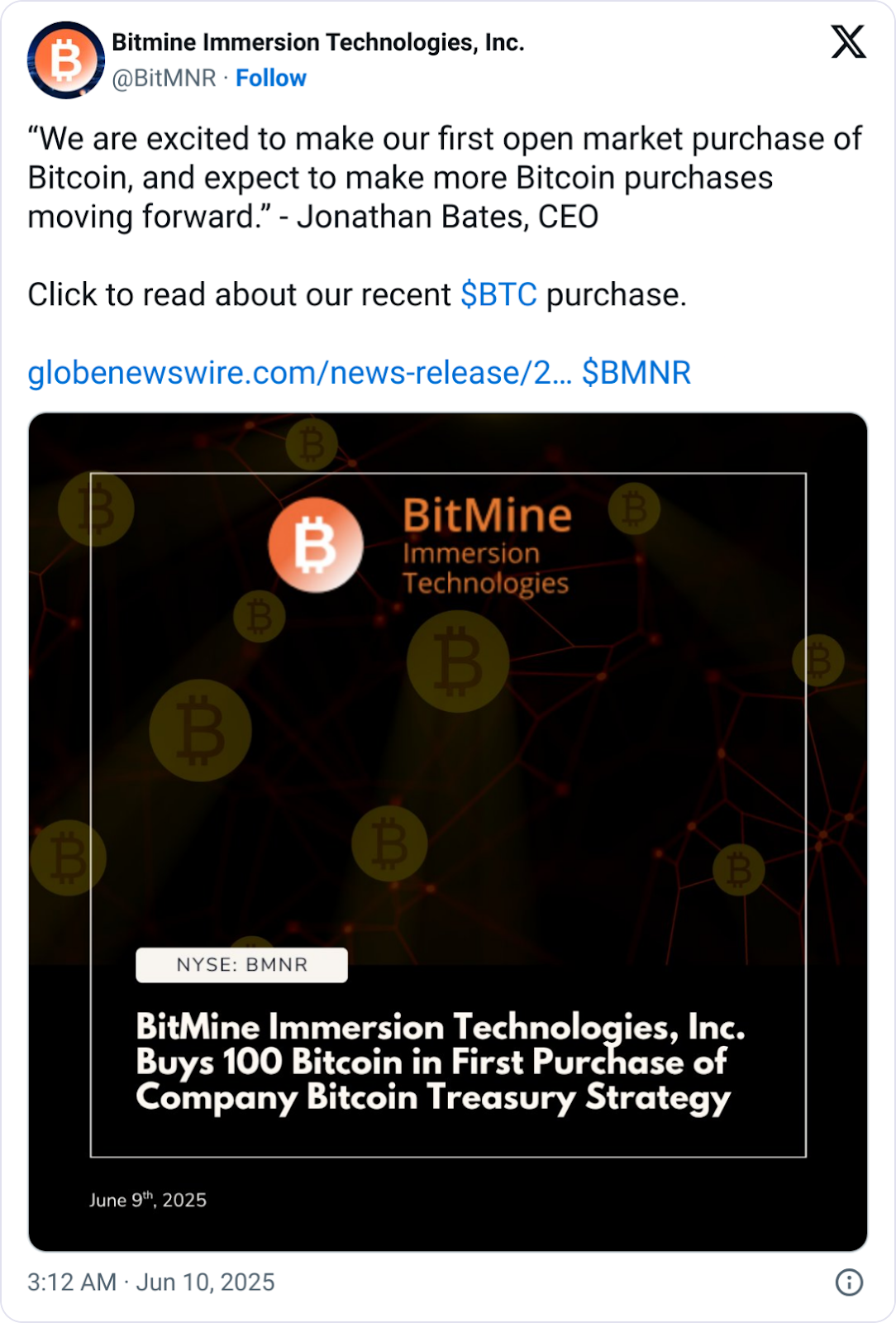 The latest company to join the trend was Bitcoin mining equipment rental firm BitMine Immersion Technologies, Inc. (BMNR), which said on Monday that it bought 100 BTC for the first time to hold in reserve after a Wednesday share offering that targeted an $18 million raise.