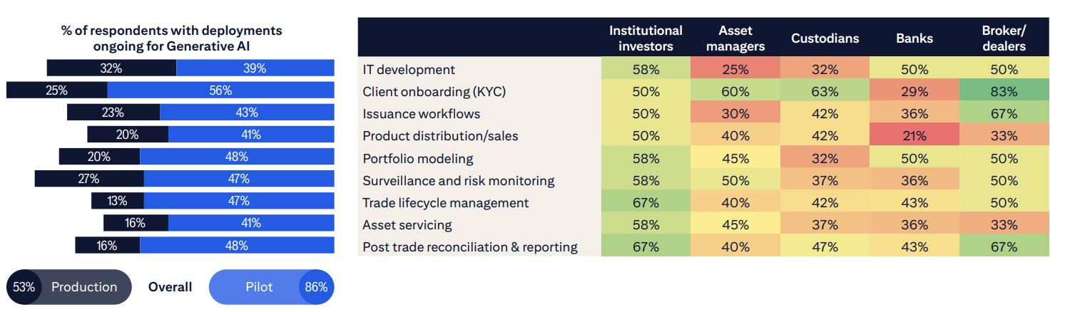 GenAI is also expected to play a part in the post-trade market with 57% of respondents indicating that their organizations are piloting the technology for post-trade operations.