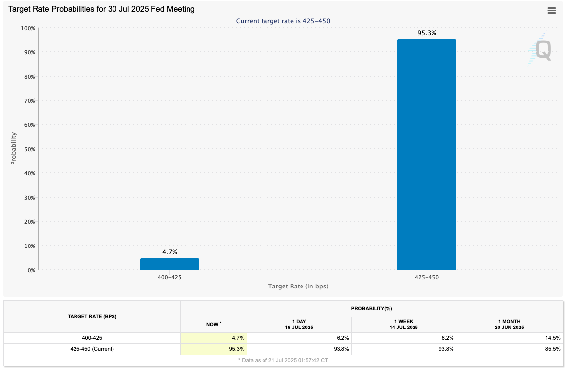 The latest data from CME Group’s FedWatch Tool puts the odds of a July cut at under 5%.