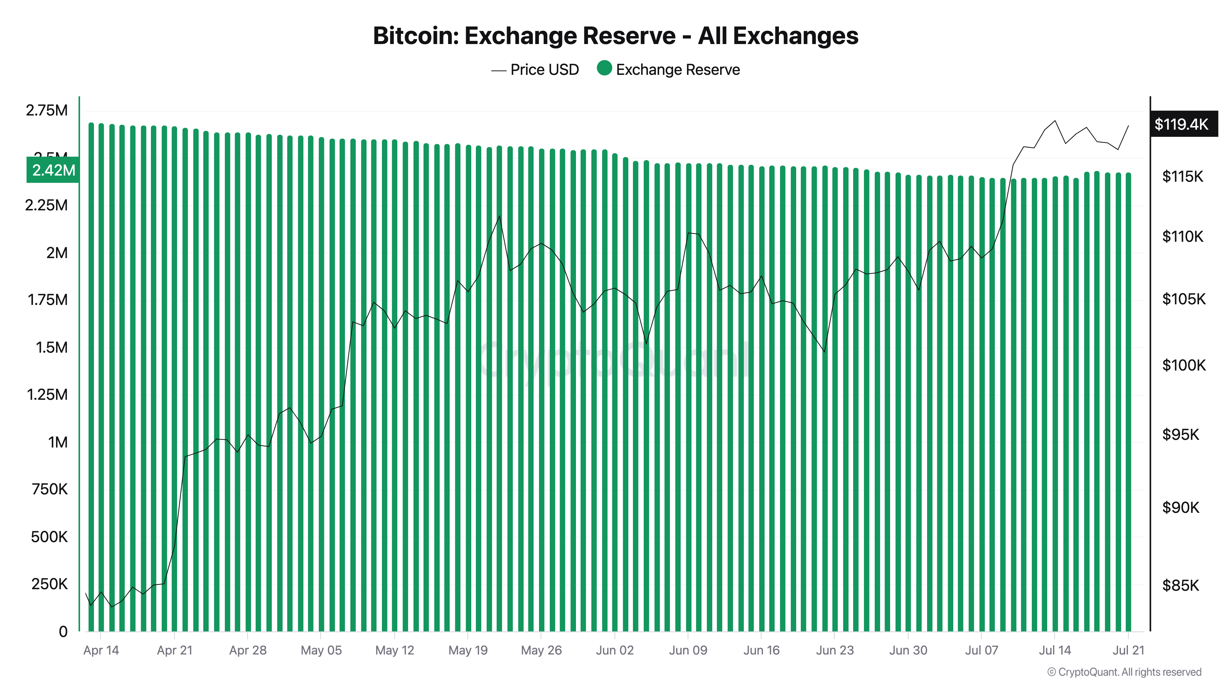 Centralized exchanges’ BTC stocks have hit their highest since June 25.