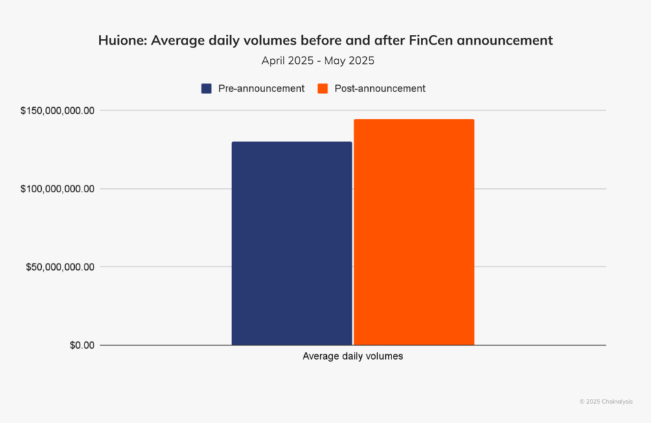 Chainalysis said US banks typically react immediately and sever ties upon announcement to avoid regulatory risk. However, Huione has proven resilient against authorities.