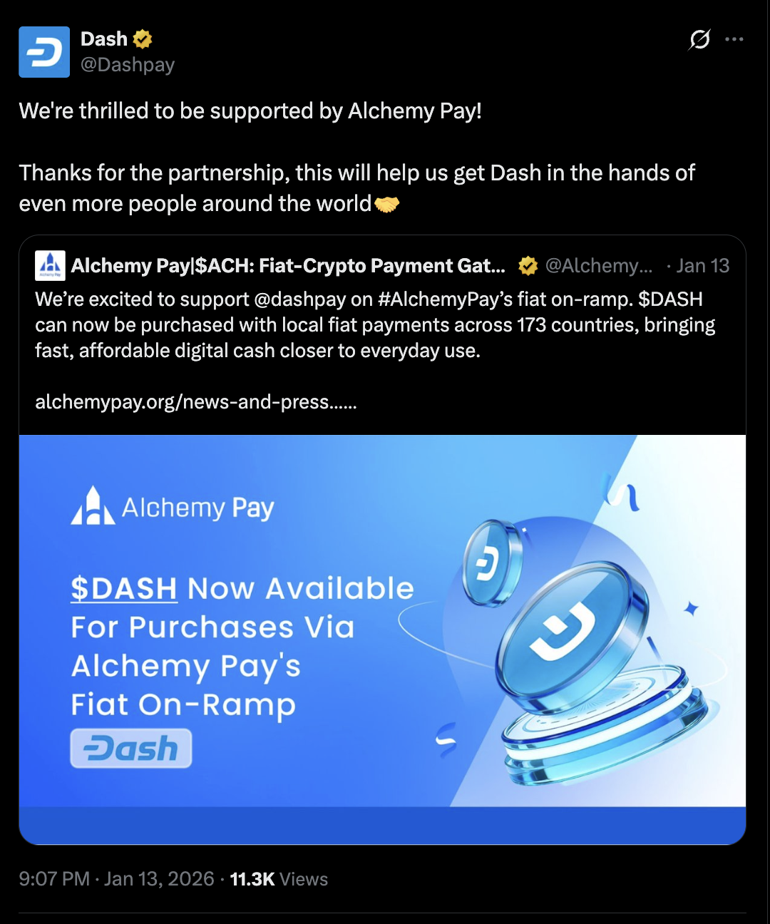 DASH’s rally further followed the network’s partnership with Alchemy Pay, a move that expands fiat on- and off-ramp access across 173 countries through more than 300 payment channels.