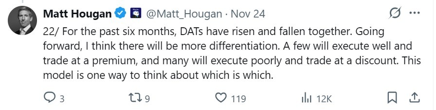 Hougan said the sector is heading to a sharper differentiation where a handful of DATs will earn durable premiums while others may drift into persistent discounts.